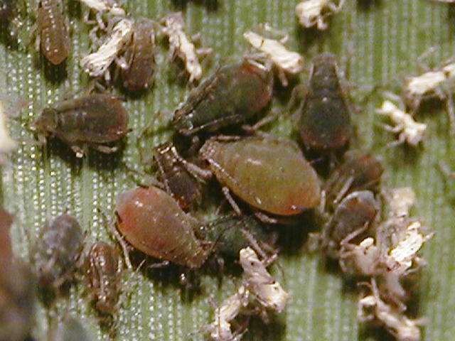 ムギクビレアブラムシ 体色は暗緑色で腹部後方は赤色を帯びる