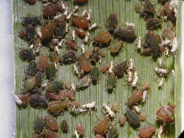ムギクビレアブラムシ 体色は暗緑色のほか、赤褐色のものもある