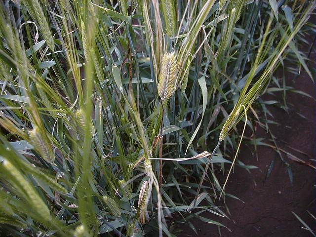 オオムギ斑葉病発病穂(5月上旬、穂首が枯れている)