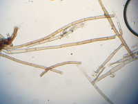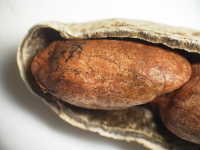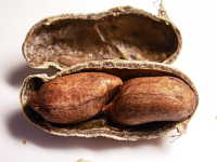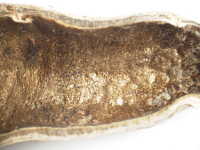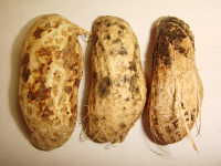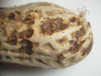 被害:莢に不整形の褐斑を生じ、病徴が進むと莢の内部及び種皮も褐変する。