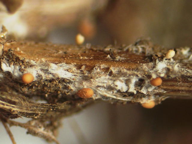白絹病 褐色菌核(直径0.8mm)及び白色菌糸