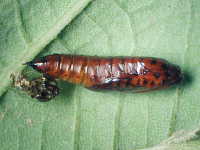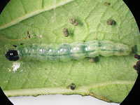 | 発生時期:8月〜9月 被害:幼虫による葉の食害 参考:幼虫は葉を巻き、その中で食害 |