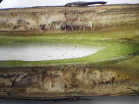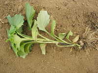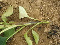 | 発生時期:7月 病原:糸状菌(かび) 伝染方法:発病残さ上の病原菌が伝染源となる。 被害:地際部の茎が褐変腐敗する。 |