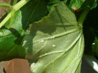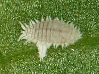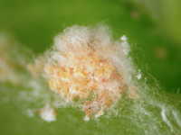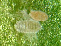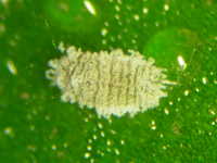 | 発生時期:3月(ハウス内) 被害:成虫及び幼虫による吸汁害 参考:ミカンコナカイガラムシは背に1本の縦線(蝋物質が少なく線のように見える)がある。 これに対してフジコナカイガラムシは縦線がない。 |