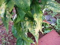 被害:葉に黄緑色の濃淡モザイクを生じ、株が生育不良となる。