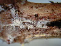 被害:地際部の茎に白色綿状のかびを生じ、後にネズミ糞状の菌核を生じる。
