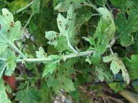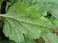 | 発生時期:10月 病原:糸状菌(かび) 伝染方法:発病葉上の病原菌が伝染源となる。 被害:葉裏に褐色の楕円形病斑を生じる。 |