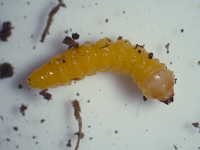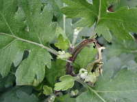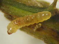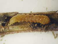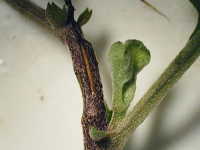 | 発生時期:産卵による葉のしおれは4月下旬〜5月下旬。幼虫の食害は5月〜秋。 被害:産卵部位の上の茎が萎れる。幼虫が侵入している茎は次第に葉が枯れる。 |