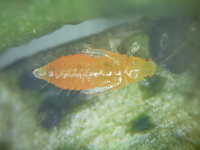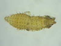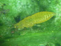 被害:成虫及び幼虫の加害により葉に白色小斑点を生ずる。