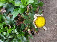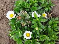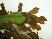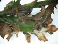 | 発生時期:4月 病原:糸状菌(かび) 伝染方法:ほ場に残った発病葉・発病果上の病原菌や、地表面に菌核として残った病原菌が、伝染源となる。次期作では、そこから胞子が飛散して伝染する。 被害:葉先が褐変し、次第に広がる。湿度が高い条件では、白い菌糸と灰色の分生子を発生する。 |