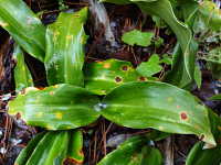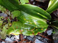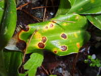 被害:葉に赤褐色の円形病斑を生じ、次第に灰白色になる。