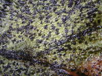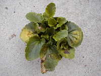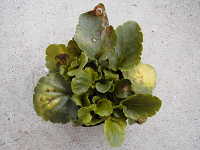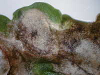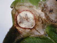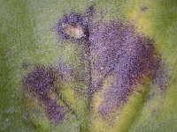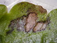 | 発生時期:11月(ハウス内) 病原:糸状菌(かび) 伝染方法:土壌中に残った発病葉上の病原菌が伝染源となる。土はね伝染する。 被害:葉に円形病斑やすす状のかびを生じる。 |