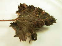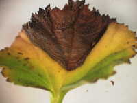 | 発生時期:周年(温室内) 病原:糸状菌(かび) 伝染方法:土壌中に残った発病葉上の病原菌や、地表面に菌核として残った病原菌が伝染源となる。 被害:花や葉に褐色不整形病斑を生じ、病斑部には灰色のかびを生じる。 |