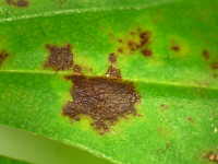 被害:葉に褐色の病斑を生じ、病斑部には灰色のかびを生じる。