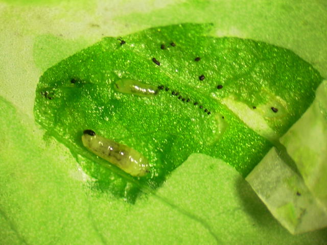 ナモグリバエ幼虫(体長2.5mm、1mm)