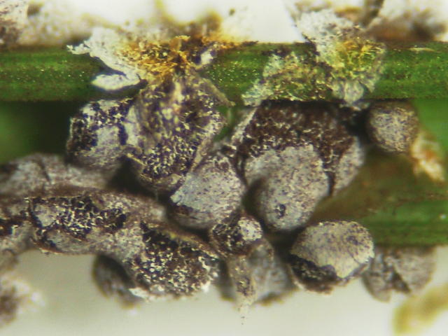 ほこりかび病 灰白色の胞子のうの中に胞子がつまっている