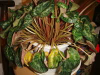 被害:始め葉の一部が黄化し、次第に葉柄や花茎にシワやクビレを生じて、株全体が枯れる。
