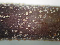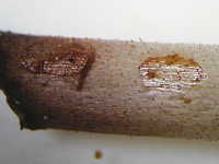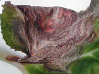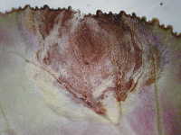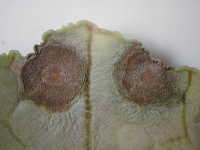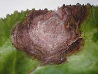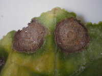| 発生時期:8月〜9月 病原:糸状菌(かび) 伝染方法:土壌中に残った発病葉上の病原菌が伝染源となる。土はね伝染する。 被害:葉に褐色の円形病斑を生じる。湿度が高いときには、病斑上に鮭肉色の胞子を形成する。 |