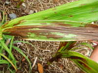 | 発生時期:4月〜5月 病原:糸状菌(かび) 伝染方法:土壌中に残った発病葉上の病原菌や、地表面に菌核として残った病原菌が伝染源となる。 被害:葉及び花に褐色水浸状の病斑を生じ、病斑部には灰色のかびを生じる。 |