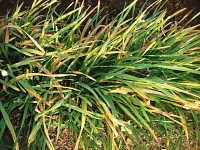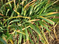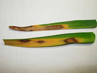 被害:葉身の先端に褐色の斑点を生じ、拡大して褐色紡錘形病斑となり、周囲が黄変する。