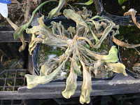 被害:地際部の葉柄に白色綿状のかびを生じ、後にネズミ糞状の菌核を生じる。