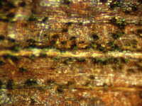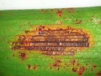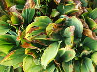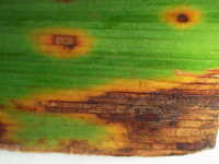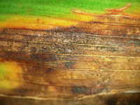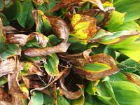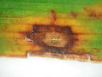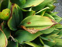 | 発生時期:8月 病原:糸状菌(かび) 伝染方法:雨滴の飛沫により伝染する。 被害:楕円形〜紡錘形の褐色病斑を生じ、葉枯れを起こす。 |