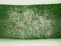 | 発生時期:9月〜10月 病原:糸状菌(かび) 伝染方法:発病葉上の病原菌が伝染源となる。晩秋に子のう殻が形成され、翌年の伝染源となる。 被害:葉にうどん粉状の病斑を生じる。 参考:やや乾燥した条件で発生しやすい。 |