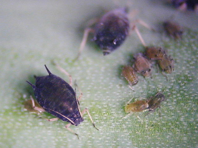 ワタアブラムシ成虫(体長1.8mm)及び幼虫