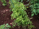 土壌中の糸状菌(かび)が、根に寄生する際に感染する土壌伝染性ウイルス(ムギの縞萎縮病ウイルス)もある。 接ぎ木による感染や、整枝剪定や収穫作業中にハサミについたウイルス感染株の汁液で他の健全株に感染することもある。 3 ウイルスによる被害 葉が濃淡のモザイクや奇形になる。株全体が萎縮する。葉にえそ(組織が死んで褐色になる)斑点を生じるなどの被害。 従来のウイルス病は、致命的な被害を生じるもの(黄色表示)が多かったが、近年発生したウイルス病では、果実被害がほとんどないものも見られる。