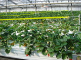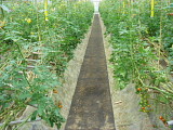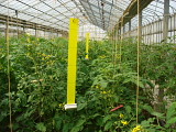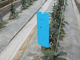 (5)有色粘着トラップにより、ハウス内の虫を捕殺するとともに発生を監視する。 コナジラミ類やアブラムシ類は黄色に、アザミウマ類は青色に集まる性質があるため、黄色や青色の粘着トラップをつるす。