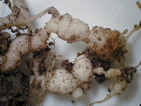 (3)耕種的防除対策 ア 田畑転換を行う。 イ 良質な堆きゅう肥を増量して施用する。 植物寄生性センチュウを食べる糸状菌、細菌、小動物が繁殖するため、被害が軽減される。 ウ 石灰窒素を農作物の植え付け前に、10a当たり50〜100kg施用する。 石灰窒素が水と反応してできるシアナミドは、センチュウの殺虫効果がある。なお、石灰窒素(CaCN2)は、窒素を20%含有するため、窒素肥料施用を大幅に減らす必要がある。 エ 施設では、夏季に太陽熱による土壌消毒を行う。 (4)土壌くん蒸剤による防除 作付け前に十分な期間を設けて、土壌くん蒸剤で土壌消毒を行う。 センチュウ防除用として、比較的価格の安いD-D剤の使用が多いが、土壌病害には効果が期待できない。 (5)接触型殺線虫剤による防除 土壌くん蒸より簡単な方法として、作付け前の殺線虫剤の全面土壌混和がある。 |