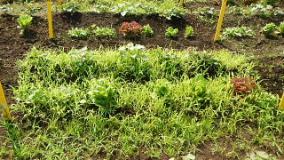 6 雨による肥料成分の流亡を抑制できる 7 使いやすい穴あきマルチ(幅95cm)と対象野菜 (1) 1条、株間30cm エンサイ、カボチャ、サツマイモ、サトイモ、ジャガイモ、スイカ、ズッキーニ、トウガン、ナス、ピーマン、モロヘイヤ、ヤーコン、ルバーブ (2) 2条、株間30cm アズキ、イチゴ、インゲン、エダマメ、オクラ、カリフラワー、キャベツ、キュウリ、サヤエンドウ、シカクマメ、シソ、ソラマメ、ダイコン、トウモロコシ、トマト、ハクサイ、ブロッコリー、ラッカセイ (3) 5条、株間15cm カブ、コマツナ、シュンギク、タマネギ、チンゲンサイ、ニラ、ニンニク、ホウレンソウ、ミツバ、ミズナ、ラッキョウ、ルッコラ、レタス類 |