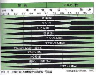 5 大学農園のpH測定値は6.3~7.0(平成28年2月測定) 作付面積の多いジャガイモ、サツマイモ栽培にはやや高いので、当分の間は石灰施用を行わない。 6 土壌pHと野菜の必須要素の吸収しやすさの関係