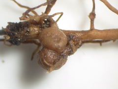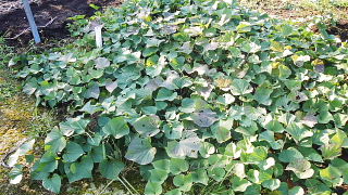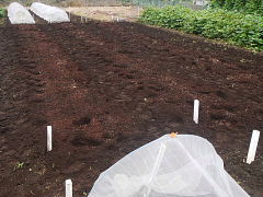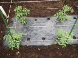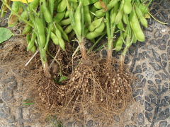 (2)ジャガイモはN・7g/㎡ ジャガイモは窒素が多いと、茎長が1m以上に伸びて繁茂し、イモの内部に蓄積するデンプンが不足して、ホクホクしない「水っぽいイモ」になるため、化成肥料をやや少なく施用している。 (3)マメ類はN・5g/㎡ マメ類は根についた窒素固定能力のある根粒菌(細菌)と共生して、空気中の窒素を利用するため、化成肥料は少なく施用している。