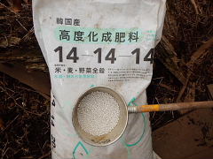 1 肥料は高度化成肥料(N・P・K 14-14-14)を使用。 この肥料にはN(窒素)、P(リン酸)、K(カリウム)の肥料三要素が、いずれも肥料重量の14%含まれている。 2 肥料の三要素の働き N(窒素) タンパク質の材料で、主に植物を大きく生長させる作用がある。特に葉を大きくさせるため「 P(リン酸) 主に開花・結実に関係し、「 K(カリウム) 主に根の発育と細胞間の浸透圧調整に関係するため、「 3 基肥はN(窒素) 10g/㎡を基本としている 高度化成肥料(N・P・K 14-14-14)を70g/㎡施用すると、N(窒素)を10g/㎡施用したことになる。