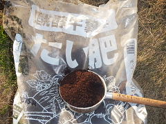 | 1 作付け前に牛糞堆肥を500g/㎡施用 大学農園では、毎作、牛糞堆肥を施用している。 学生が施用する場合は、1㎡当たり「ひしゃく」ですりきり2杯を施用する。 ひしゃく1杯は600mlであり、2杯で1,200ml×堆肥の比重0.4=500g/㎡となる。
