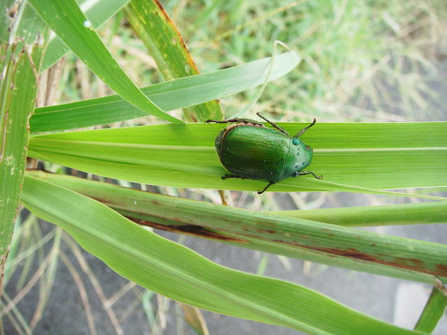 アオドウガネ成虫 セイバンモロコシの葉を食べる