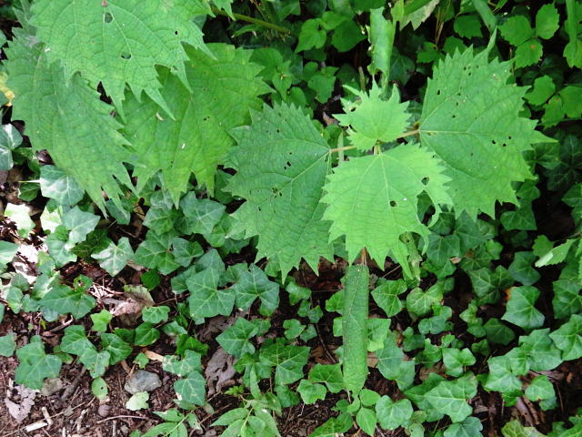 ヒメウコンノメイガ老齢幼虫によるヤブマオの巻葉