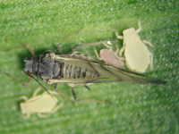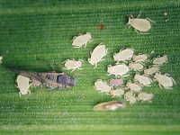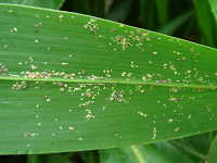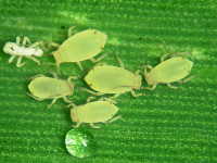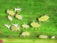 | 発生時期:6月〜9月 被害:成虫及び幼虫による吸汁害 参考:ヒエノアブラムシの天敵であるテントウムシやクサカゲロウが多数発生するため、ナス畑の周囲にソルゴーを植栽するとナスの減農薬栽培が可能となる。 |