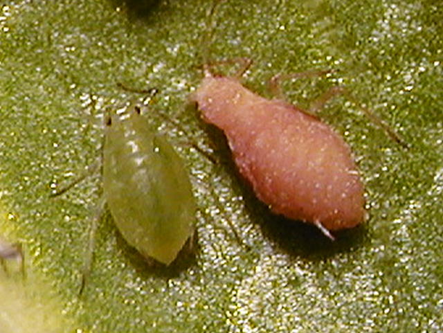 昆虫疫病菌に寄生されたモモアカアブラムシ(右側)