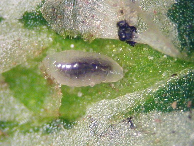ハモグリミドリヒメコバチ幼虫(体長1.2mm)