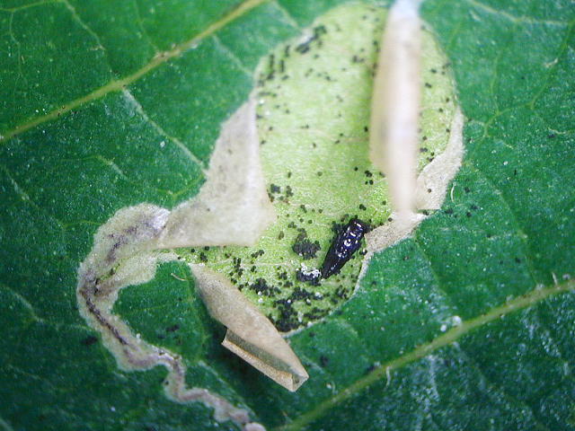 カキホソガに寄生したヒメコバチ類繭(体長1.5mm)
