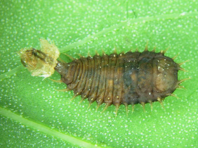 ヒメコバチに寄生されたカメノコハムシ中齢幼虫(体長6mm)