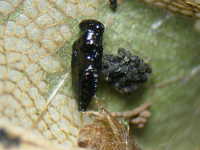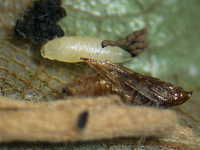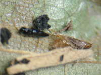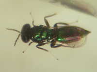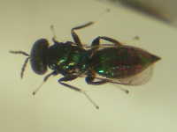 | 活動時期:春〜秋 生息地:クリ園 寄生する害虫:ハスオビキンモンホソガ 参考:成虫が麻痺させたハスオビキンモンホソガ幼虫のそばに産卵する。キンモンホソガ幼虫が蛹になった後に、ホソガ蛹からハチの幼虫が出てきて蛹化する。 |