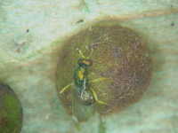 参考:シロダモタマバエが作る虫コブ内に天敵ヒメコバチ類が産卵する。
