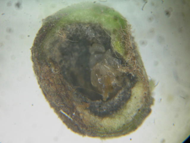 虫コブ内でシロダモタマバエ幼虫に寄生したヒメコバチ類幼虫