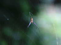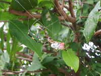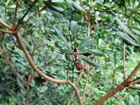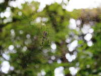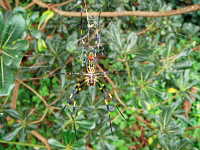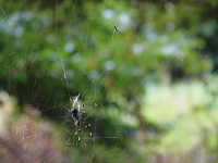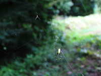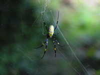 参考:雌生体は雄生体の約3倍の体長がある。秋の林縁で発生が多い。網は大変大きく、直径1mにもなり、地上1.5m〜2mの高さに作るため、人の顔に当たりやすい。