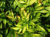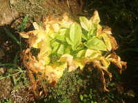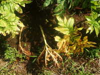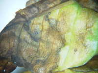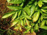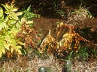 | 発生時期:8月〜9月 病原:細菌 伝染方法:風雨により伝染する。土壌伝染と種いも伝染もする。 被害:葉に褐色油浸状病斑を生じ、拡大して葉全体が軟化腐敗する。更に葉柄が軟化腐敗して株が倒伏する。 |