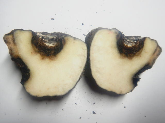 乾腐病 菌糸発生箇所は内部が黒く腐敗