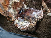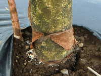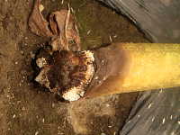 被害:地際部に白色絹状の菌糸を発生するとともに、茶褐色のアワ粒大の菌核を生じ、株が倒伏する。